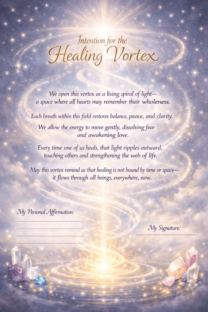 Imagine the vortex settling gently into your heart, continuing to spin with your chosen purpose — steady, luminous, and alive.